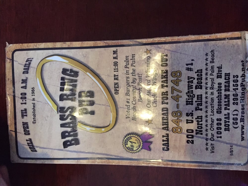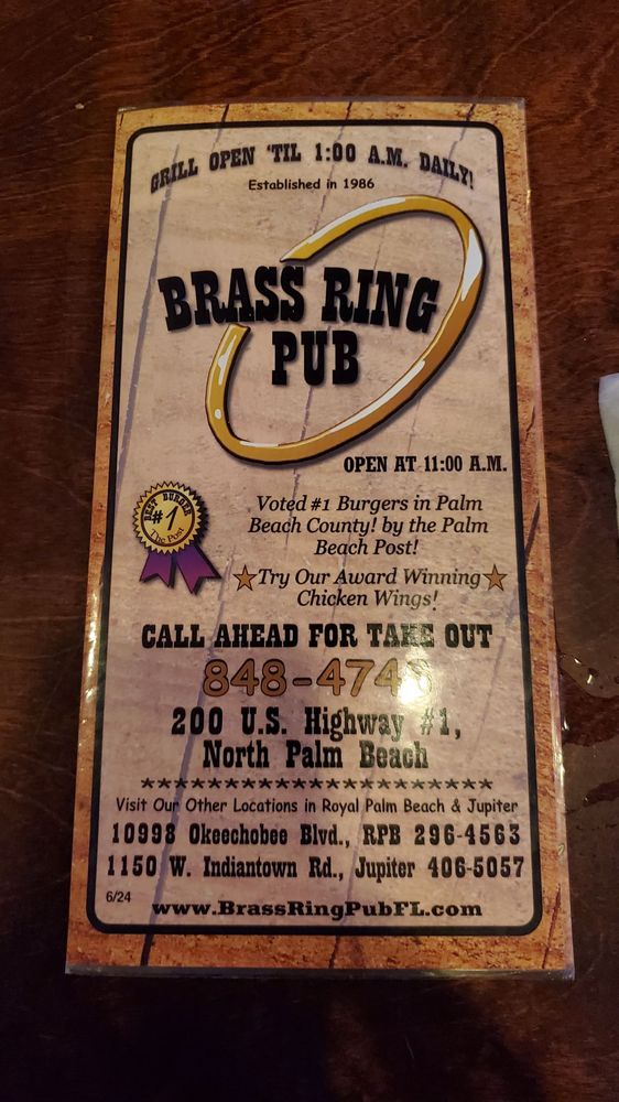 Brass Ring Pub in North Palm Beach is a vibrant spot offering delicious burgers and chicken wings. Known for its diverse menu offering vegan and vegetarian options, this pub provides a welcoming atmosphere perfect for lunch, dinner, or late-night cravings. With amenities like pool tables, a jukebox, and happy hour specials, Brass Ring Pub is ideal for groups and families alike. The friendly staff, full bar, and laid-back environment make it a go-to spot for locals and visitors. Don't miss out on the unique dining experience at Brass Ring Pub!